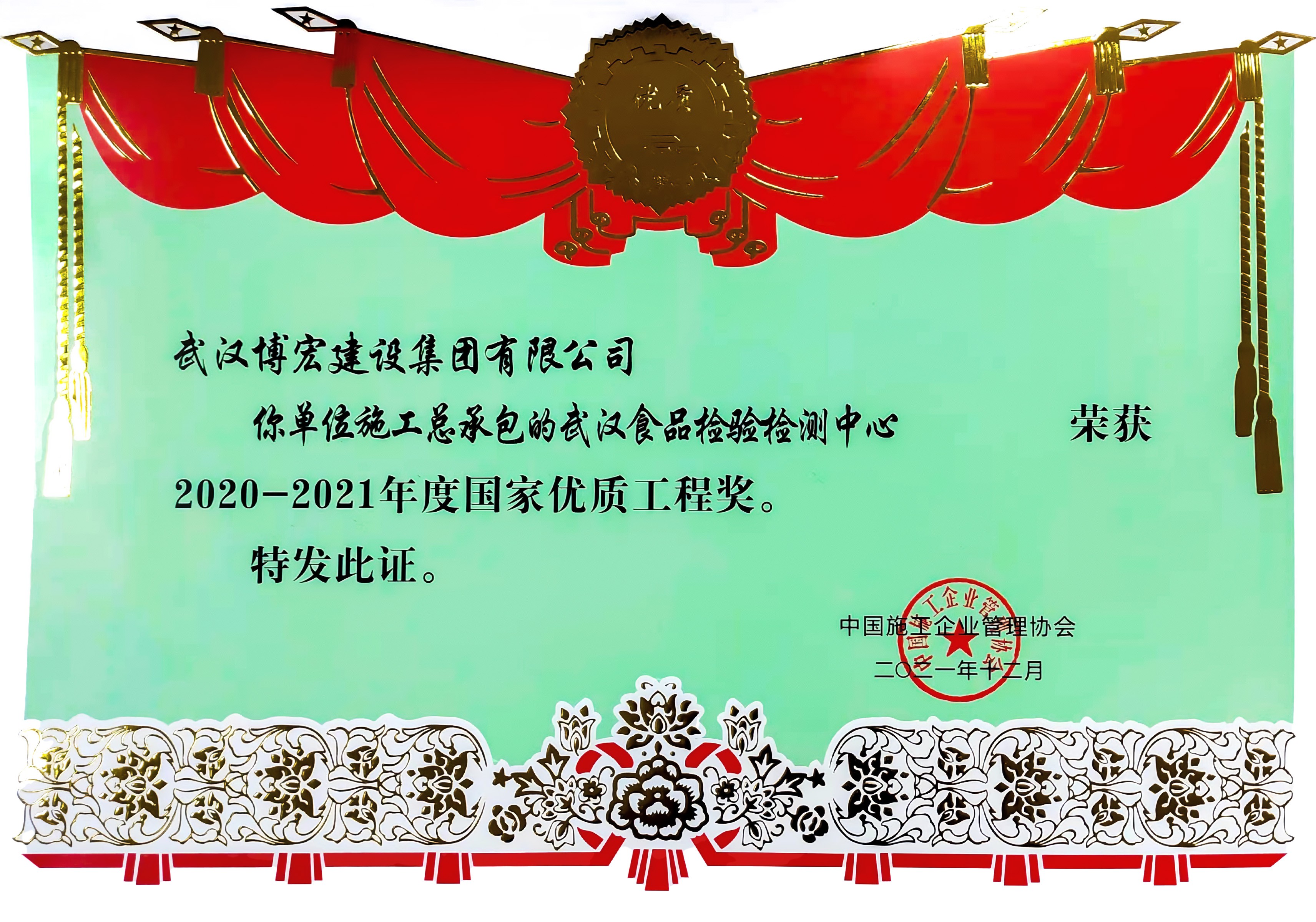 2020-2021年度國家優(yōu)質(zhì)工程獎(jiǎng)-武漢食品檢驗(yàn)檢測中心