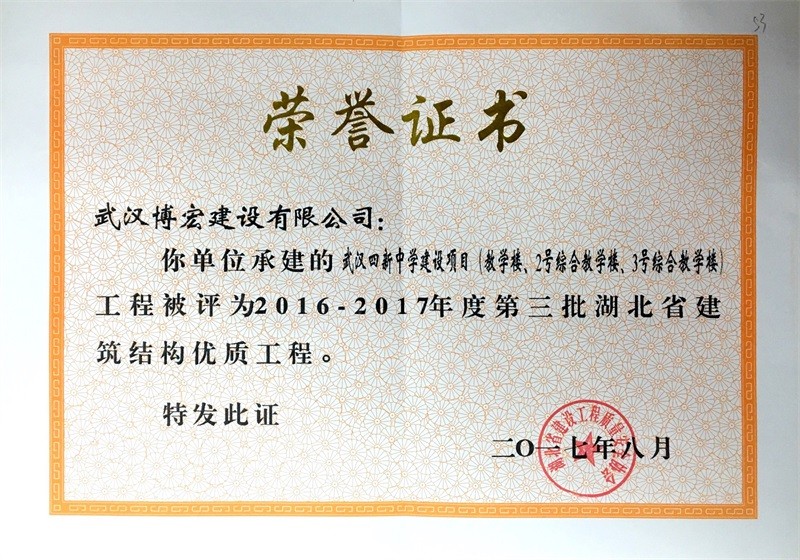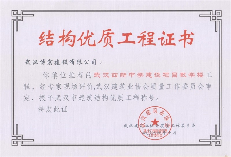 結(jié)構(gòu)優(yōu)質(zhì)工程證書(武漢四新中學綜合教學樓1-4號樓)