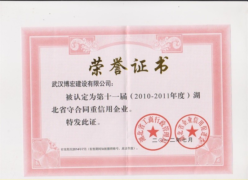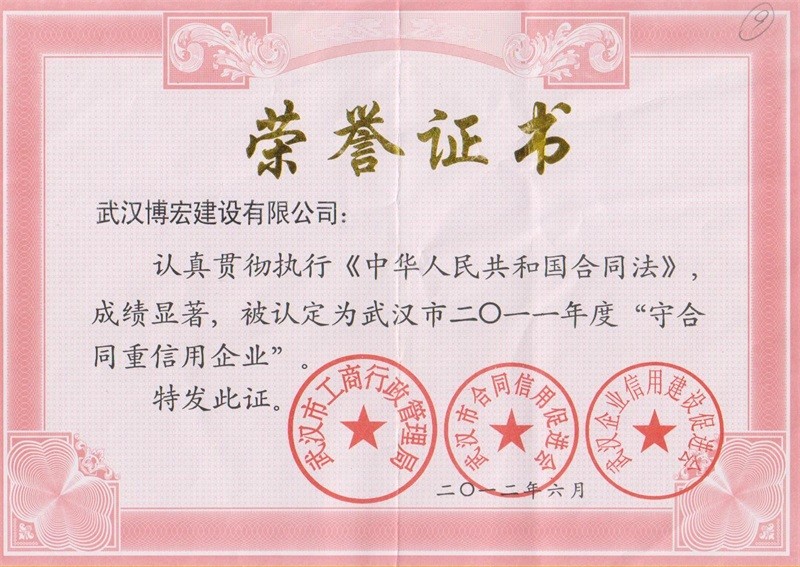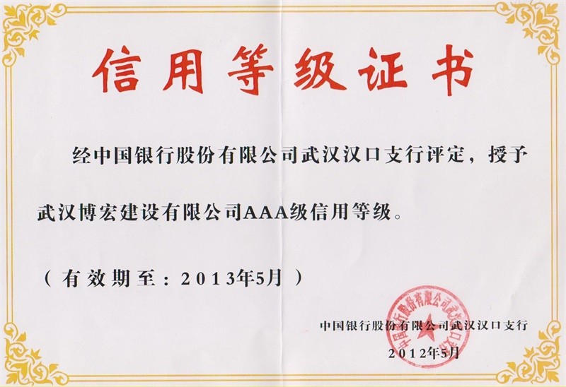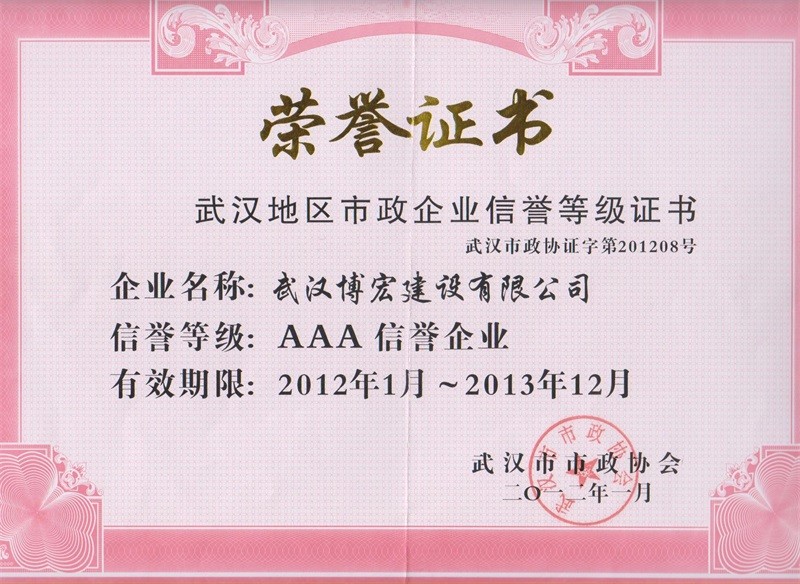 2012-2013年度武漢地區(qū)市政行業(yè)企業(yè)信譽等級證書