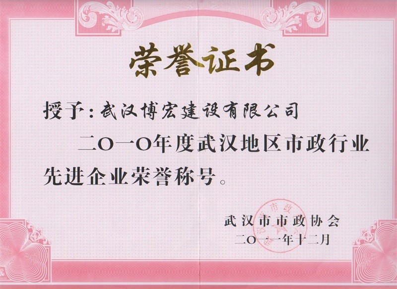 2010年度武漢地區(qū)市政行業(yè)先進企業(yè)榮譽稱號