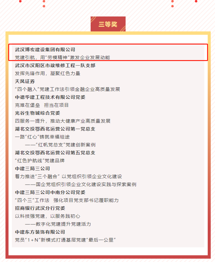 ? ? ? ?近日,首屆新時代企業(yè)黨建創(chuàng)新案例獲獎名單公布,由博宏建設集團推送的《黨建引航,用“勞模精神”激發(fā)企業(yè)發(fā)展動能》品牌案例斬獲黨建優(yōu)秀案例三等獎。?該項活動由湖北省新時代文明實踐研究院、華中科技大學馬克思主義學院、華中科技大學黨的建設研究中心聯(lián)合紅艦智庫等機構共同發(fā)起,博宏建設集團推送的品牌案例在百余項案例中脫穎而出。