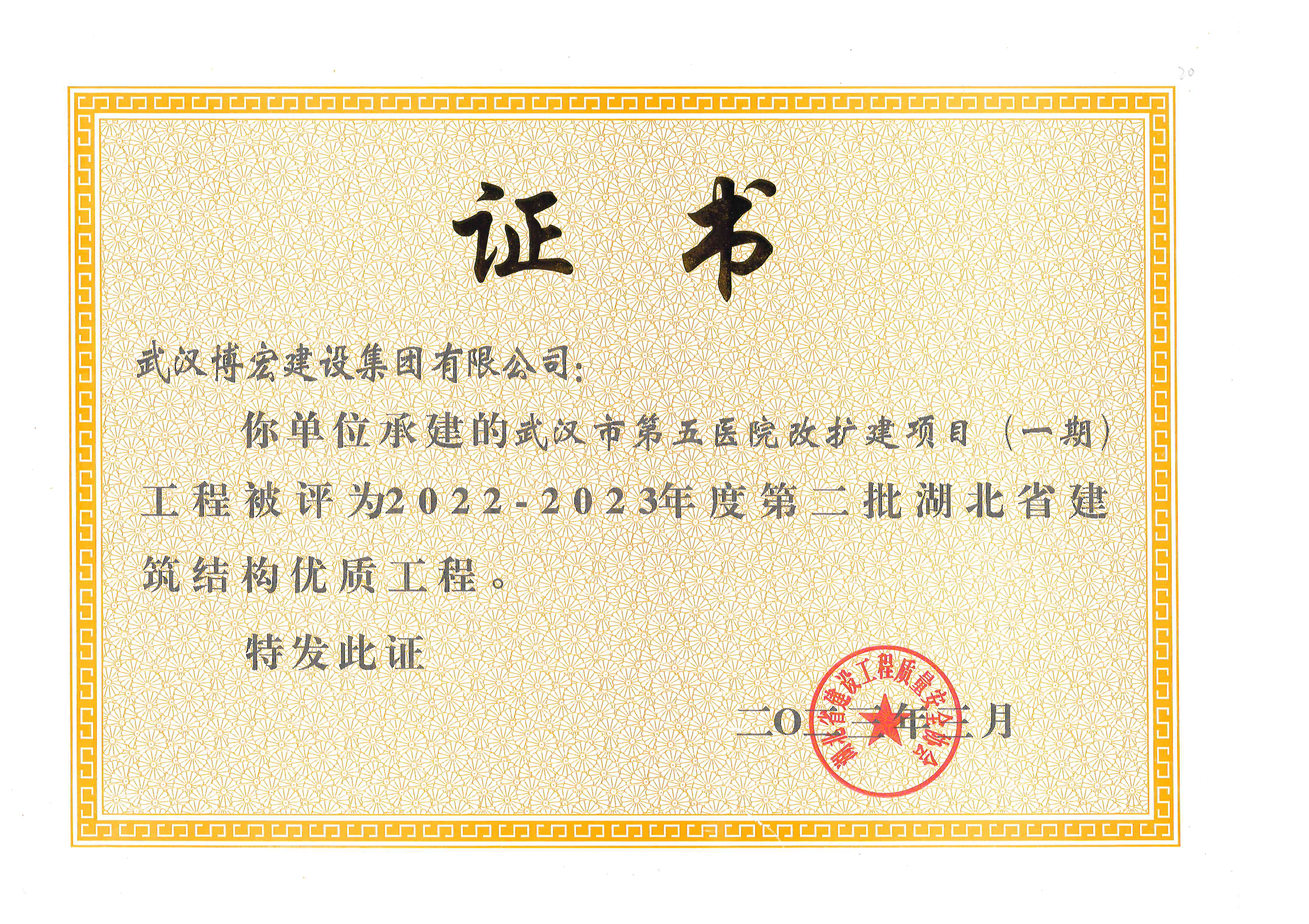 近日,湖北省住建廳2022—2023年度第二批湖北省建筑結構優(yōu)質工程項目名單出爐,由博宏建設集團承建的武漢市第五醫(yī)院改擴建項目(一期)、新建居住項目(長投·長河九里一期)(二標段)3#、5#樓榮獲湖北省建筑結構優(yōu)質工程獎。“湖北省建筑結構優(yōu)質工程獎”是湖北省建筑結構工程領域的最高獎項,獲得該獎項標志著該項目在工程結構設計、工程施工管理、材料供應保證、過程質量控制等方面均達到省級領先水平。