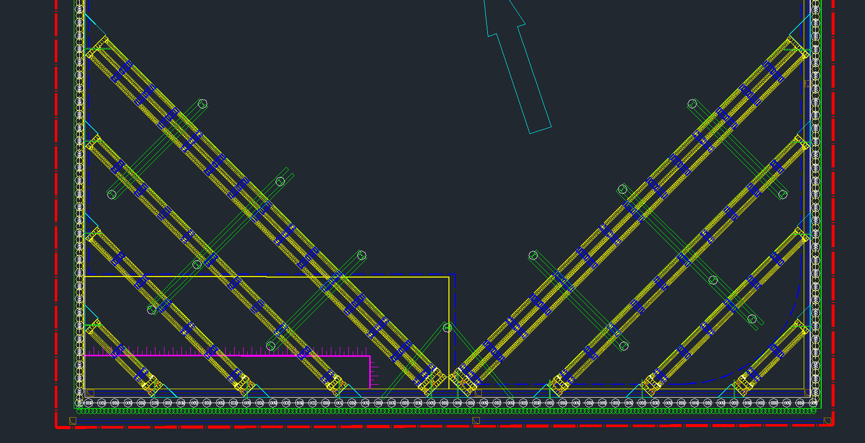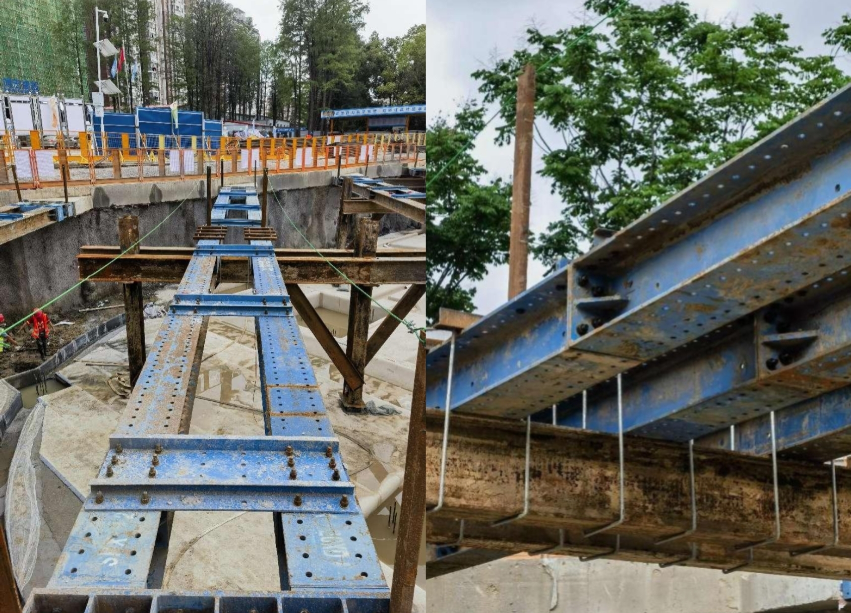基坑南北兩側采用型鋼角撐,每一側角撐由四道型鋼斜撐組成,與冠梁形成45°角,由內(nèi)向外有雙拼型鋼和三拼型鋼兩種。型鋼采用HHC400ZC,長度根據(jù)標準件長度調整100A~12000A??缍容^大型鋼支撐設型鋼立柱,采用H488型鋼立柱。