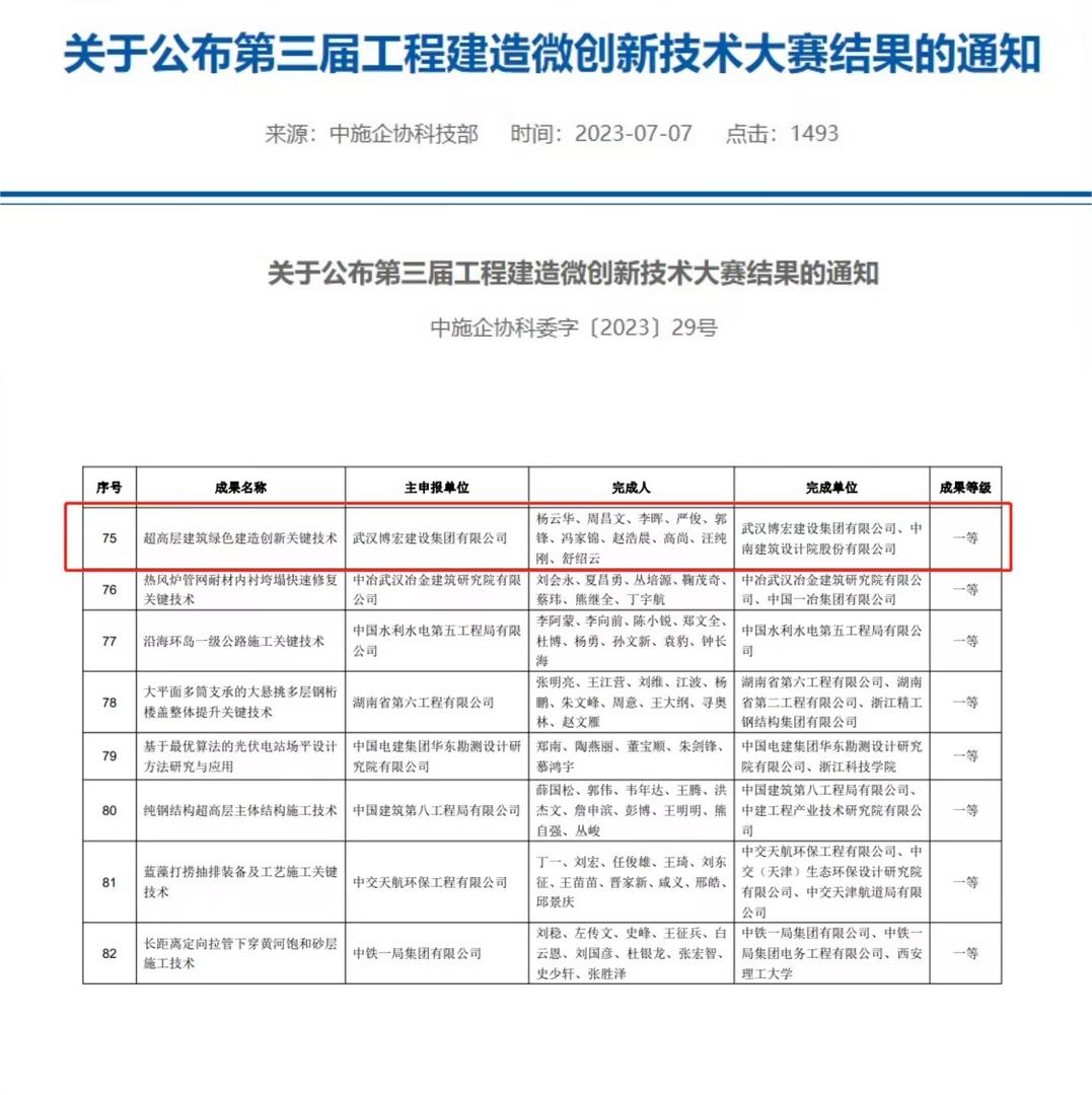 近日,中國施工企業(yè)管理協(xié)會公布第三屆工程建造微創(chuàng)新技術大賽獲獎結(jié)果。以中南科研設計中心建設項目為背景的“超高層建筑綠色建造創(chuàng)新關鍵技術”榮獲中施企協(xié)第三屆工程建造微創(chuàng)新技術大賽一等成果,這也是博宏建設集團首次獲得該類賽事一等獎。