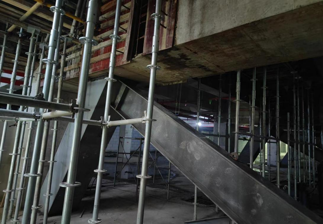 上述人字撐材料為項目副樓東側(cè)拆除懸挑鋼平臺的鋼構件進行回收利用。施工時支撐系統(tǒng)搭拆快捷,節(jié)省了人工、鋼管扣件及架體租賃費用,有效縮短了工期。該支撐系統(tǒng)具有整體剛度大、穩(wěn)定性好、節(jié)點牢固的特點,無論是安裝、拆除都十分方便,靈活性較強,極大程度地保證了現(xiàn)場的施工安全。且待結構完成后,人字撐支撐材料可拆卸回收周轉(zhuǎn)利用,創(chuàng)造了良好的環(huán)保、經(jīng)濟和社會效益。