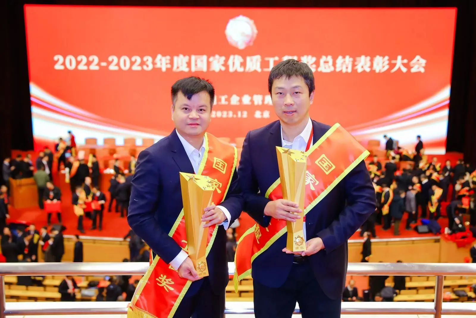 12月24日,2022~2023年度國家優(yōu)質(zhì)工程表彰大會在北京隆重召開,公司總經(jīng)理助理李暉、項目經(jīng)理童威接受頒獎。博宏建設(shè)集團捧回了兩座浸染著汗水與拼搏的榮譽獎杯。